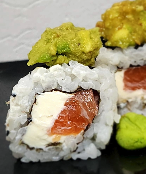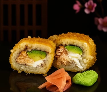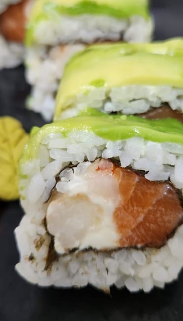 ( Langostinos, Salmón, queso, envuelto en palta)Crispy roll