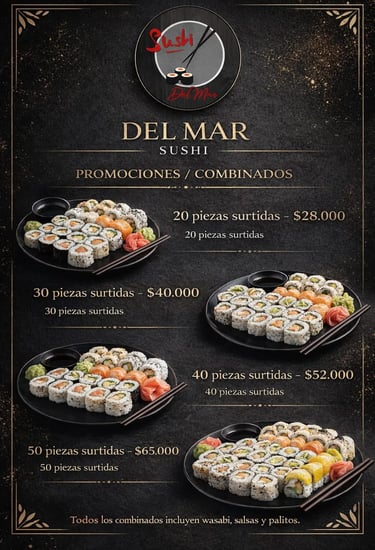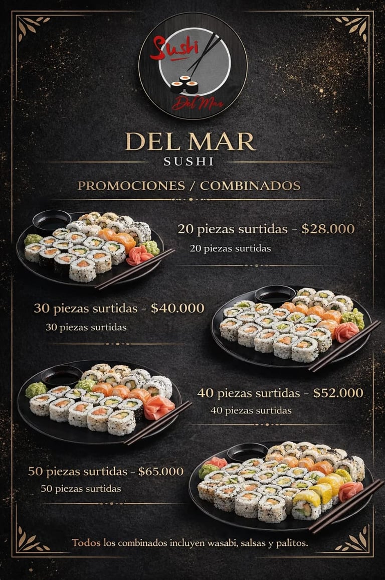 En Del Mar Sushi Olivos contamos con una propuesta variada para todos los gustos: desde los clásicos rolls hasta combinados especiales para compartir, niguiris y sashimi.